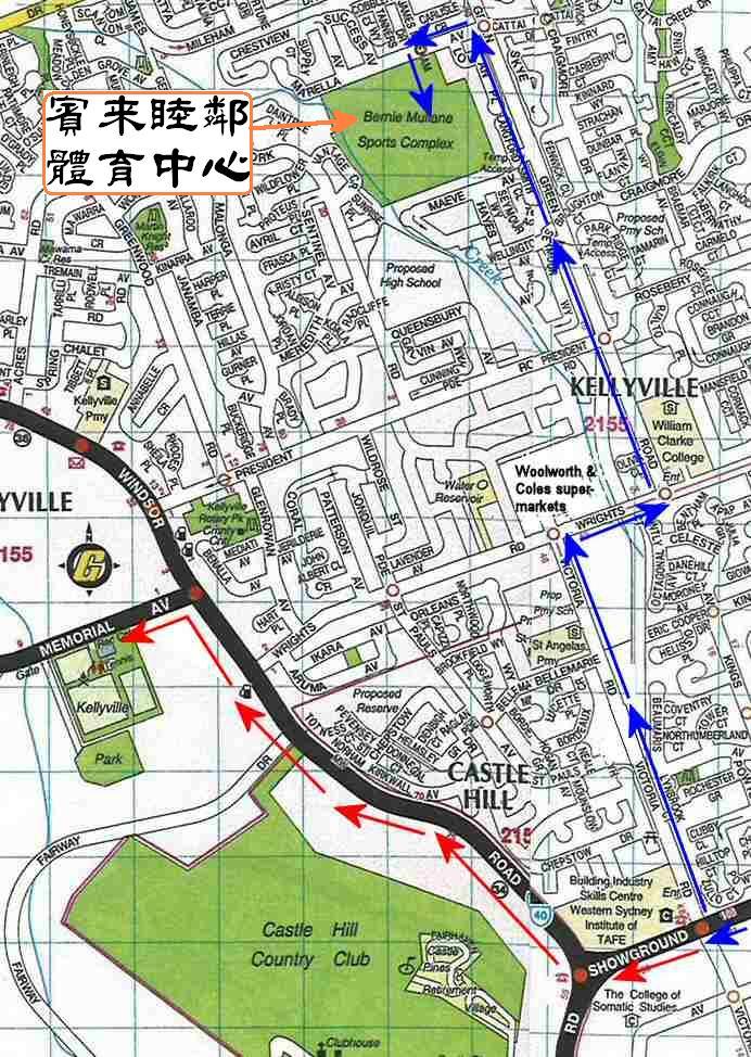 Turn left at the next round-about into Green Road. AFter turning into Green Road, you will see William Clarke College at the right-hand side of the road. Keep driving along Green Road until a round-about at the junction between Green Road, Marlee Avenue on the left and Catti Creek Drive on the right. Turn left at the round-about. Keep going until the next round-about. Bernie Mullane Sports Complex is at the left-hand side. Turn left at the round-about into the car park.